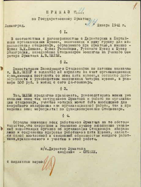 В приказе об организации стационара от 24 января 1942 года тогдашний директор Эрмитажа, академик Орбели, особо подчеркнул: «…Обращаю внимание всех работников Эрмитажа на то обстоятельство, что скорейшее и возможно лучшее выполнение указаний вышестоящих органов об организации стационара направлено к сохранению здоровья работников пяти музеев, является самой неотложной и священной обязанностью каждого работника, привлекаемого к участию в этой работе». Практически все сотрудники, остававшиеся в блокадном Эрмитаже, приняли участие в организации стационара. Работали каждый день бригадами по 5–10 человек. Помещения утеплили, поставили печи, мойки. 31 января всё было готово к приёму больных.