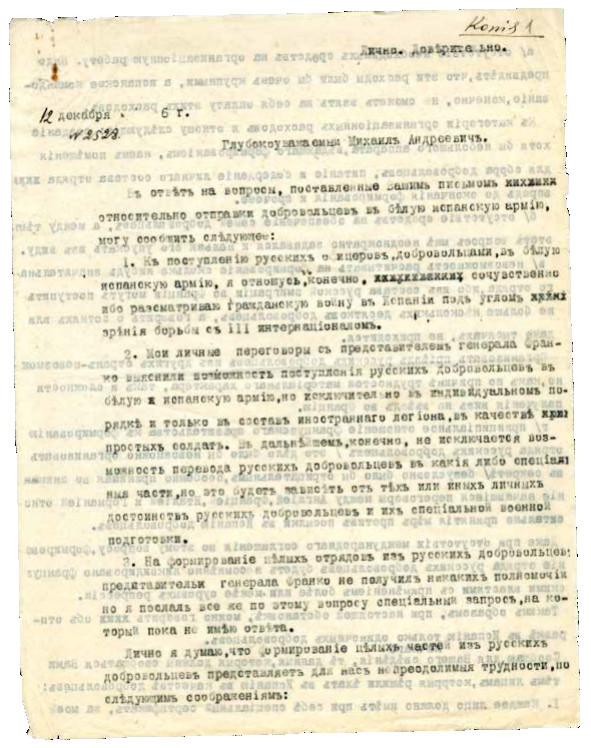 Это письмо председателя Русского общевоинского союза (РОВС) — главной военной организации белых эмигрантов — генерала Евгения Миллера неустановленному адресату было написано 12 декабря 1936 года. Оно посвящено мало освещавшейся до последнего времени теме отправки в Испанию русских эмигрантов-добровольцев, желавших сражаться в начавшейся там гражданской войне на стороне Франсиско Франко, который возглавил в июле 1936 года военный мятеж против левосоциалистического правительства Испании.