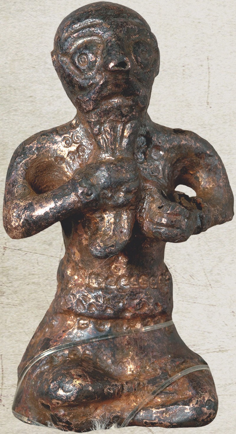 Кости женщины были обнаружены в южной части кострища, «по правую руку от мужчин воинов». Среди вещей, связанных с женщиной, были десять серпов, лежащих в ногах. Кроме того, в погребении были найдены многочисленные украшения, наконечники поясов, золотые и серебряные слитки — остатки расплавившихся в огне украшений, ключи, замки, топоры, долота и бронзовый сосуд с бабками — игральными костями. Наличие в погребении игральных бабок позволило исследователям предположить, что один из знатных воинов был ещё настолько молод, что носил неполномерный шлем и играл в бабки.