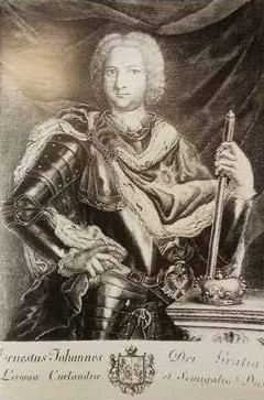 В 1892 году знаменитый московский собиратель и коллекционер Дмитрий Иванович Щукин обнаружил в одной из антикварных лавок доселе никому не известный вариант гравированного портрета Эрнста Бирона — могущественнейшего фаворита императрицы Анны Иоанновны. Фактически в первые дни после смерти императрицы правителем Российской Империи был именно он — герцог Курляндский Эрнст Иоганн Бирон. И вполне закономерно был сразу же заказан парадный портрет нового властителя. Портрет исполнил молодой, но невероятно одарённый гравёр Иван Соколов. Ещё не было до конца закончено гравирование портрета, как в ночь на 8 ноября 1740 года герцог Бирон был арестован и выслан в сибирский город Пелым, а российский трон заняла Анна Леопольдовна.
