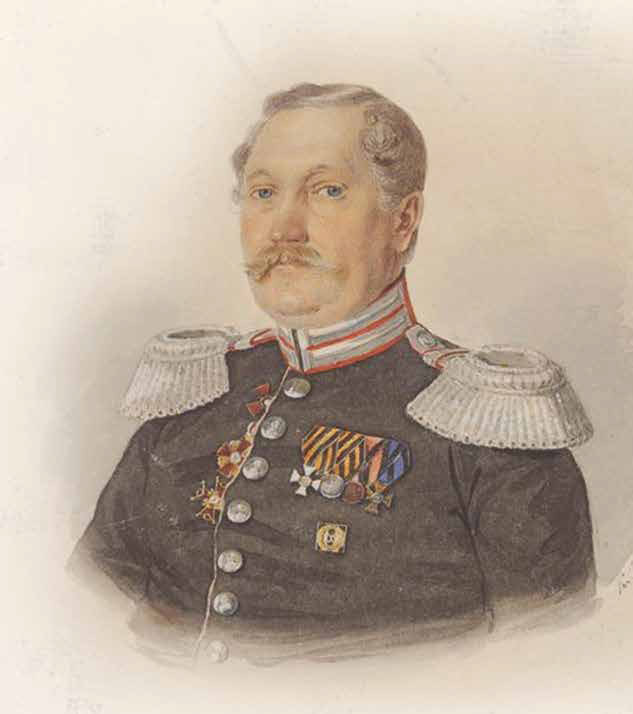 Но свой чин генерал, видимо, получил недавно. По борту его мундира из-под воротника выпущен крест ордена Святого Владимира III степени — рубежная награда в иерархии, за которой уже шёл «генеральский» орден Святого Станислава I степени. Однако его звезда на груди ещё отсутствует. Вполне вероятно, что акварели были заказаны как раз по случаю производства персонажа в генералы.