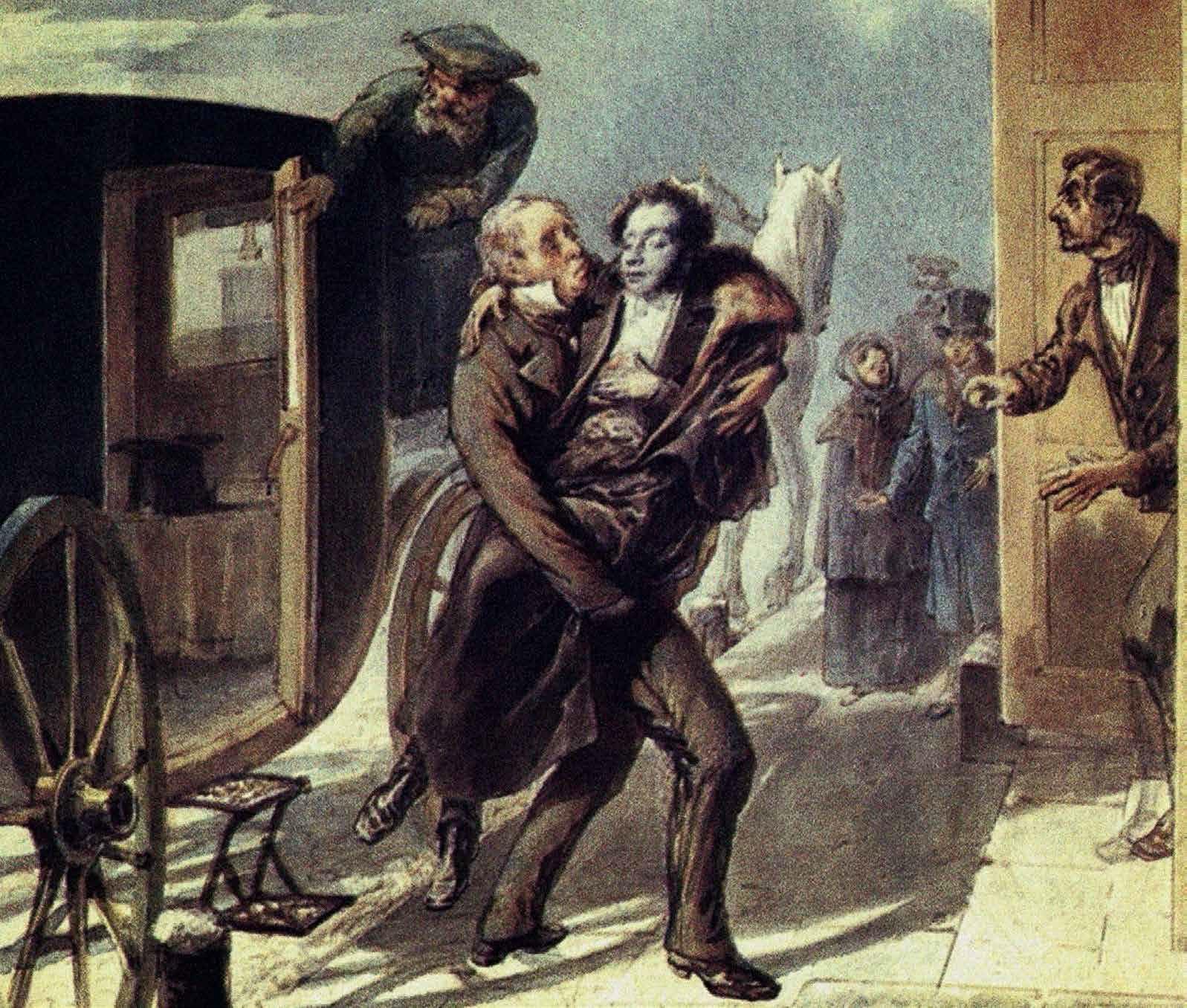 Прибытие раненого Пушкина. Гравюра Петра Бореля, 1885 год