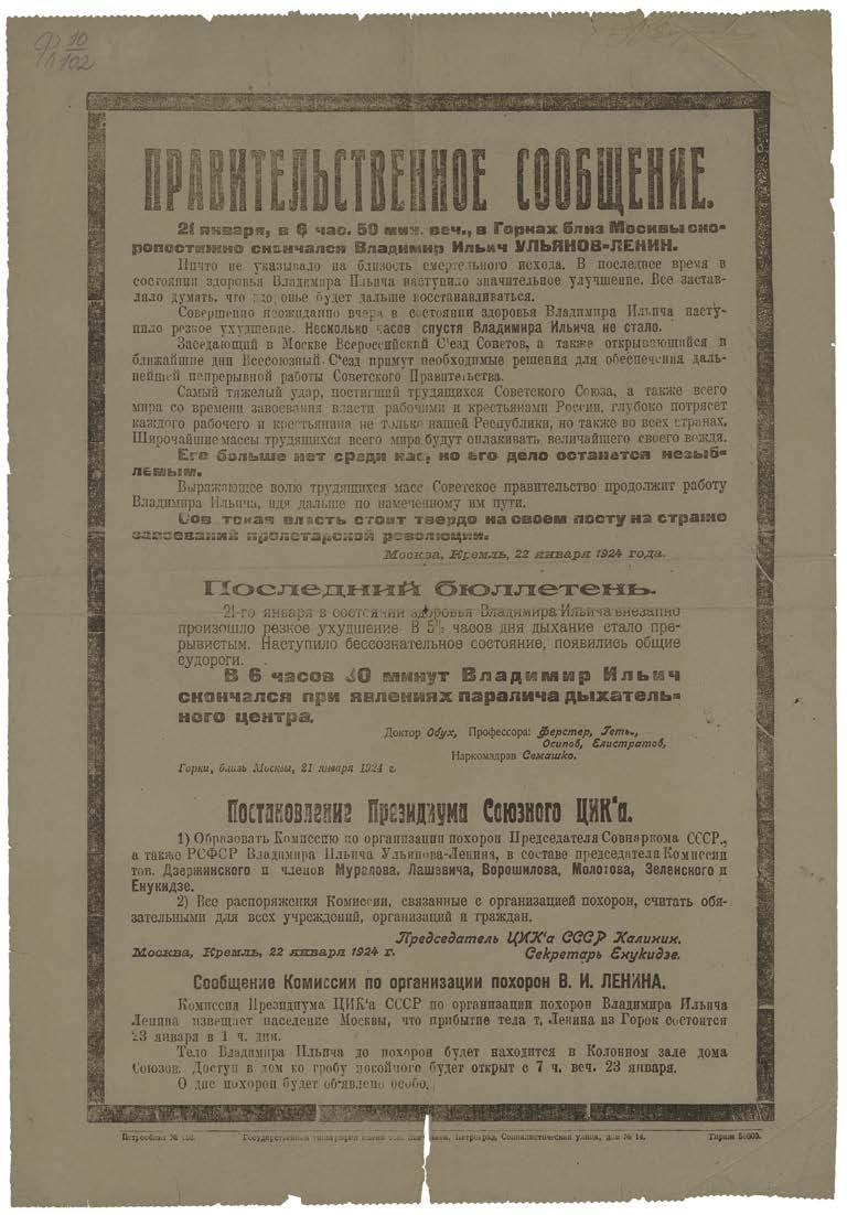 Смерть вождя российской революции, последовавшая, по официальным данным, в подмосковных Горках в 18 часов 50 минут 21 января 1924 года, стала для страны настоящим шоком. Многие просто отказывались верить правительственному сообщению о кончине Ленина, которое начало распространяться в Петрограде вечером 22 января. Похороны Владимира Ильича состоялись днём 27 января 1924 года в Москве на Красной площади, где к тому моменту уже был приготовлен временный деревянный Мавзолей. В этот день, который объявили днём «Всесоюзных похорон тов. В. И. Ленина», многотысячные демонстрации состоялись в различных городах страны. Так, в Петрограде, который уже был накануне постановлением II Съезда Советов СССР переименован в Ленинград, в траурном шествии, по данным Григория Зиновьева, приняло участие 700 тысяч человек.