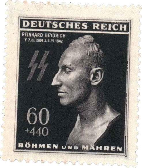Даже среди марок нацистской Германии этот экземпляр отличается своей мрачностью. Рунические молнии СС, посмертная маска, чёрный фон. Изображение производит жуткое впечатление, даже если не знать, что марка посвящена одному из самых зловещих соратников Гитлера — Рейнхарду Гейдриху.