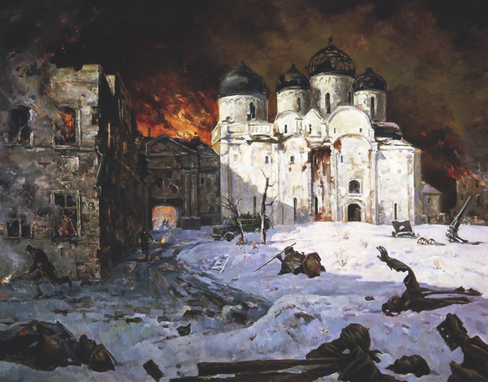 Бегство фашистов из Новгорода. Кукрыниксы, 1946 год. Символ веры. Во время войны большевики прекратили гонения на церковь. Поэтому картина поруганного врагами храма с разбросанными вокруг обломками памятника царской эпохи не только вызвала критики, но и попала в школьные учебники