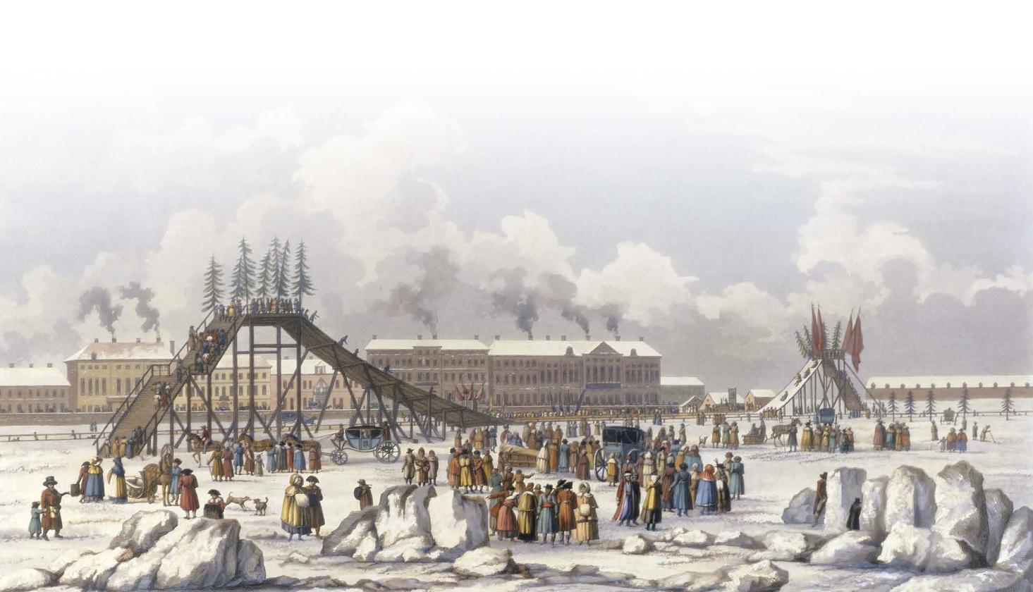 Почти каждый иностранец, посещая Россию и её новую столицу — Санкт-Петербург, обращал внимание на морозные русские зимы. Фридрих Вебер, живший здесь в период правления Петра I, писал: «Зима здесь очень суровая и продолжительная, так что на протяжении полугода можно постоянно разъезжать на санях». Несмотря на холодность зим, светская жизнь не замирала и во время праздничной Масленой недели в городах устраивали зимние забавы, часто экзотические для европейцев. Особой популярностью пользовались ледяные горы. В Петербурге их строили на льду Невы, на Царицыном лугу (Марсовом поле) и у Адмиралтейства. Обычно катальных гор было две: они строились по одной оси навстречу
