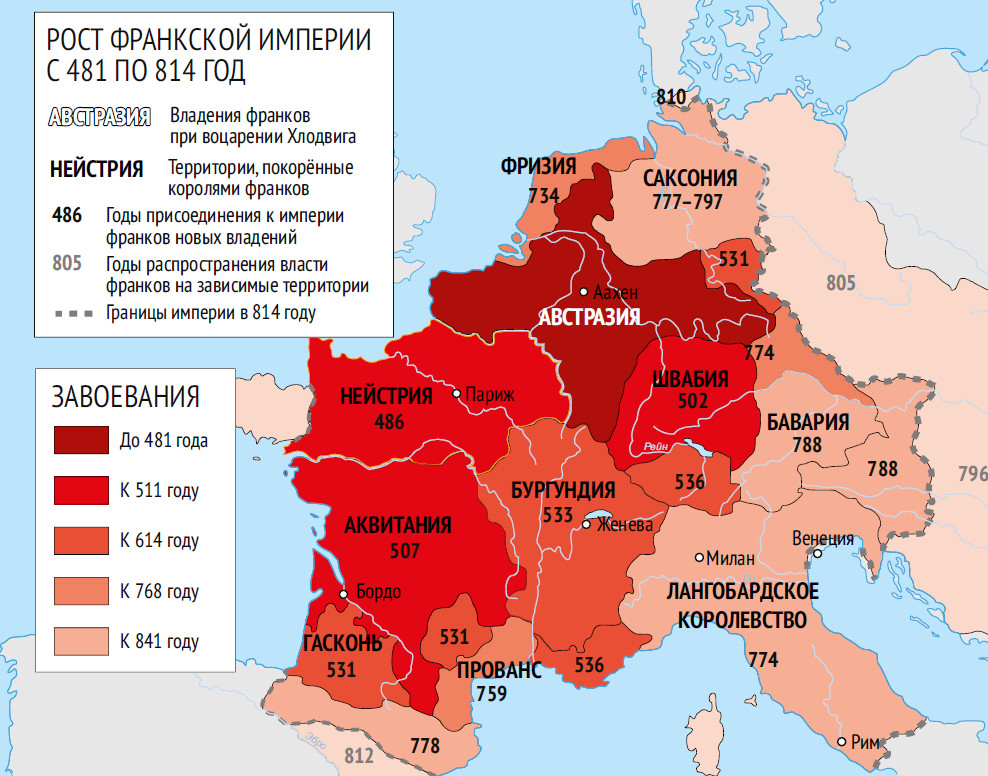 C V века германские племена франков начали активную экспансию на запад. Галлы, населявшие земли к западу от Рейна, оказывали отчаянное сопротивление. Но натиск франков был неудержим. Особенно после того, как вождь по имени Хлодвиг объединил под своей властью сразу несколько германских племён. Его потомки в итоге стали на некоторое время властителями не только Галлии, но и практически всей Западной Европы (кроме Британии, Иберии и Южной Италии). Более того, Галлия по имени завоевателей стала именоваться Францией. Современные французы без всякого беспокойства относятся к тому, что основателем их государственности является, по сути, немец. Тем более что потомки франков ассимилировались и стали говорить на языке покорённого народа.