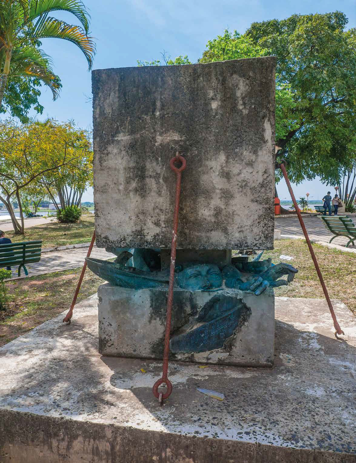 Так выглядит монумент, призванный напоминать парагвайцам о тёмных временах правления Альфредо Стресснера, который с 1954 по 1989 год восемь раз (!) переизбирался президентом страны. Памятник 35 годам диктатуры состоит из придавленной бетонным блоком статуи Стресснера; для верности конструкция стянута ржавыми скрепами, на ней надпись: «Больше никогда!»
