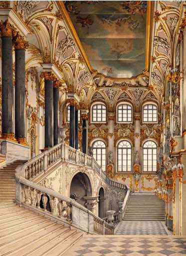 Растрелли, гений барокко, использовал в убранстве белый и бело-розовый мрамор, золочёную лепнину и многочисленные зеркала, которые иллюзорно расширяли пространство, где сливались воедино реальные и отражённые декоративные элементы. Из больших окон лился дневной свет. Вечером лестницу освещали сотни свечей. Великолепное зрелище. Не случайно у прусской принцессы Шарлотты — невесты Николая Павловича, будущей императрицы Александры Фёдоровны, в записанных позднее воспоминаниях о первом своём въезде в Зимний дворец и торжественном прохождении по парадным залам на церковную службу