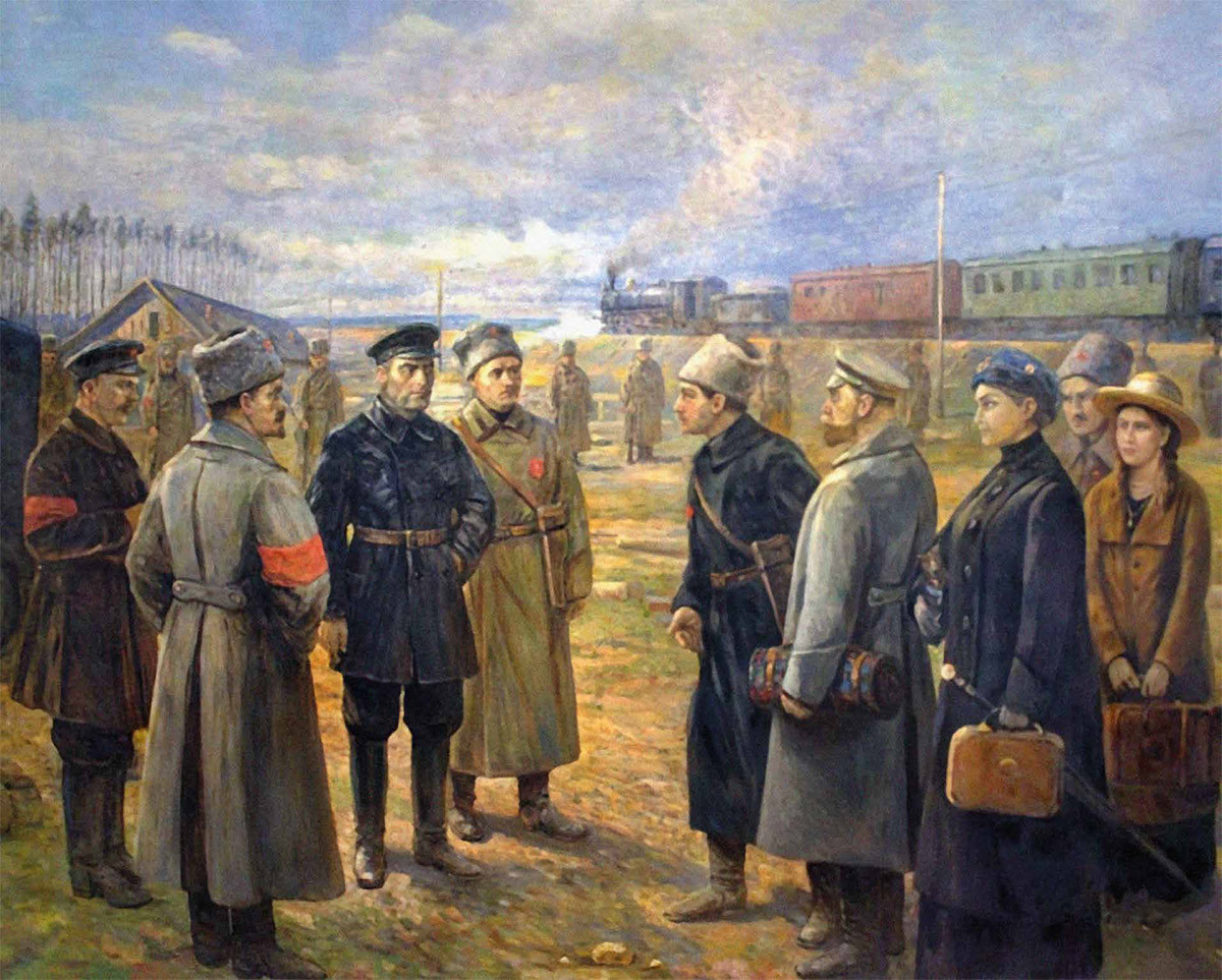 Правда, сама сцена не имеет никакого отношения к реальности: передача Романовых местным властям происходила в самом поезде, после подписания всех необходимых документов бывшего императора с женой и дочерьми посадили в автомобиль и отвезли в Ипатьевский дом. Но эта историческая неточность является замыслом художника: он хотел показать противостояние старого и нового мира в лице последнего российского царя и красных комиссаров. В музее картина выставлялась недолго: с началом репрессий художнику приходилось постоянно перерисовывать изображённых на полотне большевиков, уничтожая портретное сходство. Когда все действующие лица были расстреляны, картину из экспозиции убрали. Сейчас она хранится в музее истории Екатеринбурга.