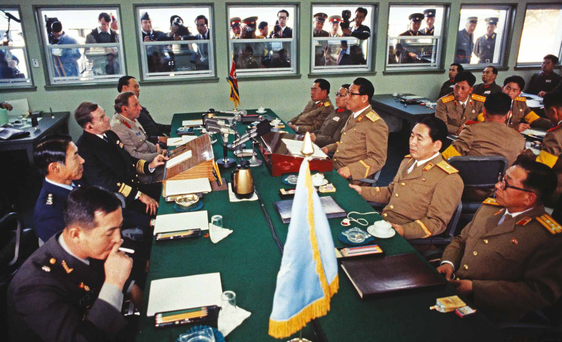 Нетрудно заметить, что переговоры между двумя делегациями ведутся за столом, который стоит точно на демаркационной линии, разделяющей Корейский полуостров на две примерно равные части — северную (Корейская Народно-Демократическая Республика) и южную (Республика Корея). Соответственно и делегации, а также находящиеся за стеклом сопровождающие их лица, включая журналистов, расположились каждая на своей стороне.