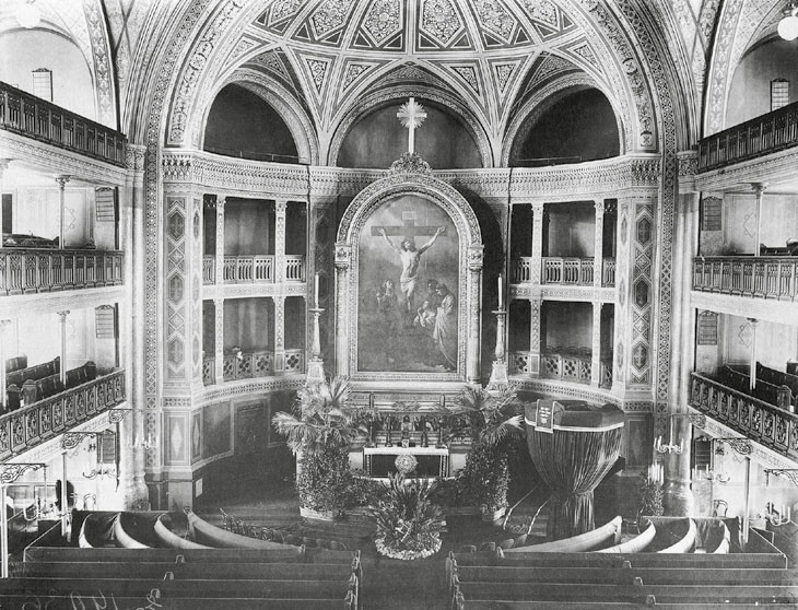 Менялся и интерьер. Желая добиться стилистического единства, зодчий Максимилиан Месмахер (1842–1906) провёл генеральную реконструкцию. Стены и своды украсили новые орнаменты. Несколько лет назад во время косметического ремонта был случайно обнаружен ещё один небольшой фрагмент росписи Месмахера.