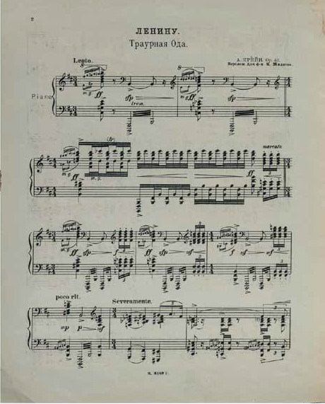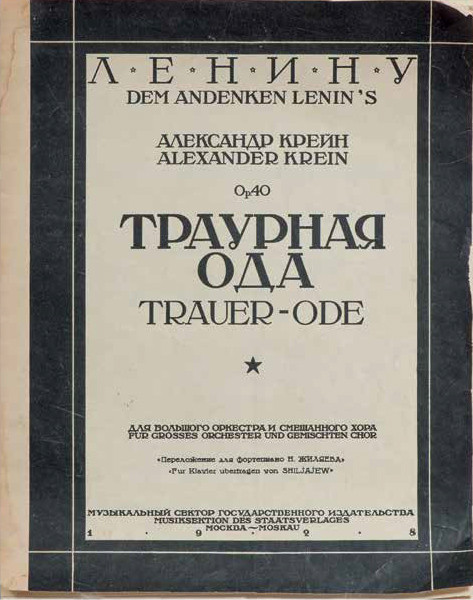 На смерть вождей писались оды. Автор этой оды — некий Александр Крейн. 1928 год. Она предназначена для большого оркестра и смешанного хора. Стихи написаны на русском и немецком языках. В конце — реклама агитационно-просветительной литературы музыкального сектора Госиздата. Порадуйтесь: Васильев-Буглай. «Ленин и РКП». Для первого голоса с фортепьяно. Или вот — Давыденко. «Про Ленина». Плакат для баса соло, без сопровождения. Слова — Алексея Кручёных! «Пять дней и пять ночей», слова Веры Инбер, колыбельная для высокого и низкого голоса. Борис Шехтер. «Как умирает вождь», стихи Василия Каменского. «Ленину» — для среднего голоса, слова Николая Асеева. Заметьте — сплошные футуристы!
