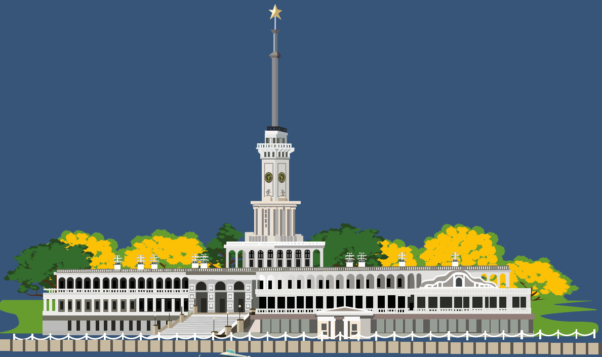 Пока строились канал и Химкинское водохранилище, на Ленинградском шоссе на будущем берегу (пока совсем сухом) архитекторы Алексей Рухлядев и Владимир Кринский возводили Московский речной вокзал. Здание получилось поистине имперским. Сталинский ампир здесь отличается венецианскими мотивами — Рухлядев и Кринский вдохновлялись Дворцом дожей. Вокзал напоминает трёхпалубное судно, а его 75-метровая башня — дымовую трубу. Дорогая отделка здания соответствует масштабу проекта: красный гранит, мрамор, майоликовые медальоны… Разбитый вокруг здания парк с его аллеями, скульптурами и фонтанами дополнил искусное творение. В 1937 году в водохранилище пошла вода, открылся вокзал и Москва стала «портом пяти морей»: двигаясь по рекам, можно попасть в Балтийское, Белое, Чёрное, Азовское или Каспийское море.