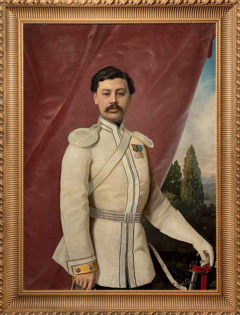 Несколько лет назад в одном из частных собраний мне показали большой поколенный портрет молодого офицера. Три золотые звёздочки на его серебряных эполетах означают чин поручика. Офицер изображён в полукафтане лейб-гвардии Кирасирского Его Величества полка по форме, установленной 14 января 1857 года. Левая рука опирается на эфес палаша с красным орденским темляком, указывающим, что поручик награждён за боевой подвиг Аннинским оружием с надписью «За храбрость».