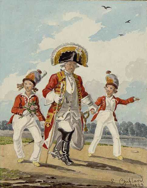 Однако акварель в Эрмитаже не похожа на другие рисунки Шифляра. На ней изображены не бравые гвардейцы, а очень странная группа — пожилой мужчина в красном кафтане и огромной шляпе, рядом с ним два мальчика в детских курточках и колпаках. На первый взгляд, это какой-то набросок художника для картины из времён Павла I.