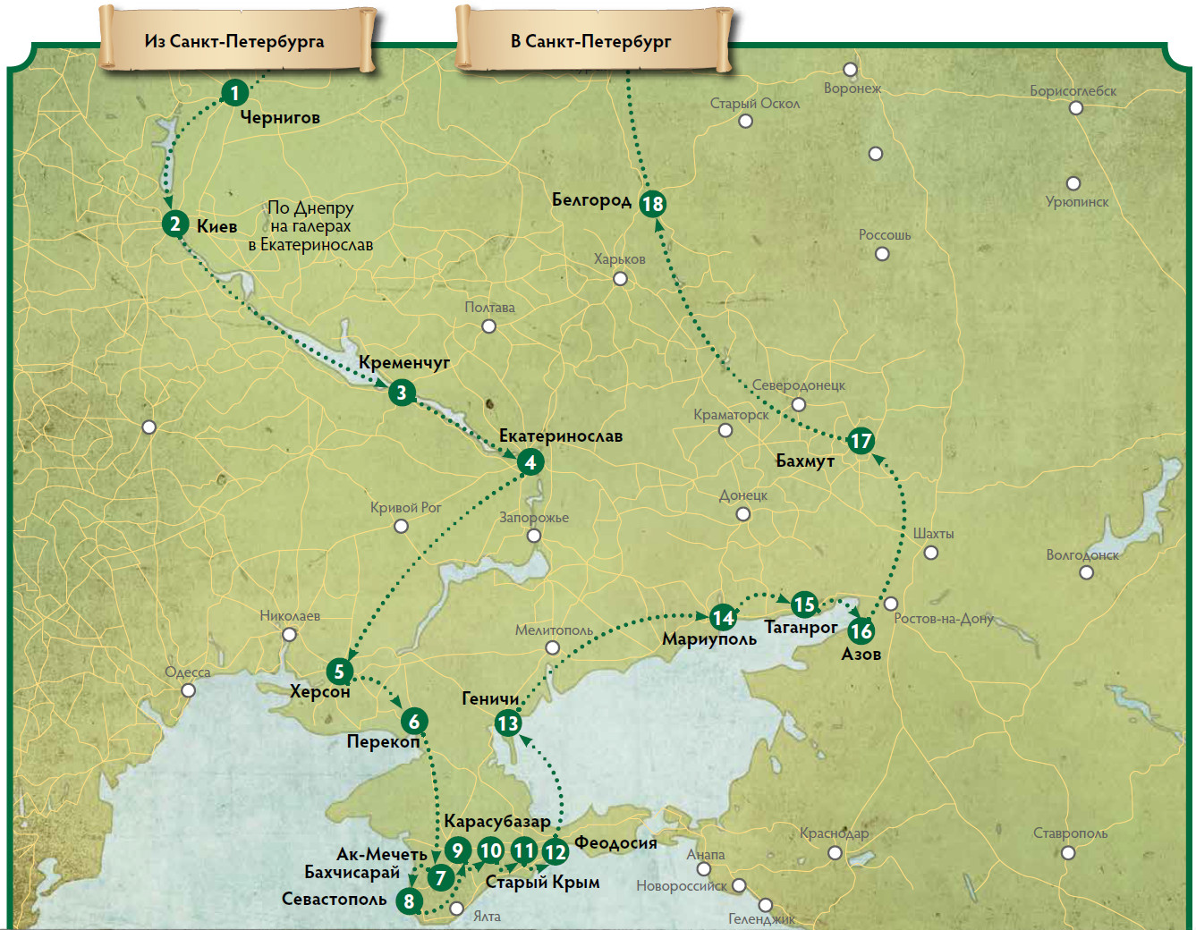 Григорий Потёмкин долго зазывал Екатерину II в Крым и в конце концов уговорил. Никто, правда, не думал, что поездка императрицы на Юг получится настолько масштабной и растянется более чем на полгода.