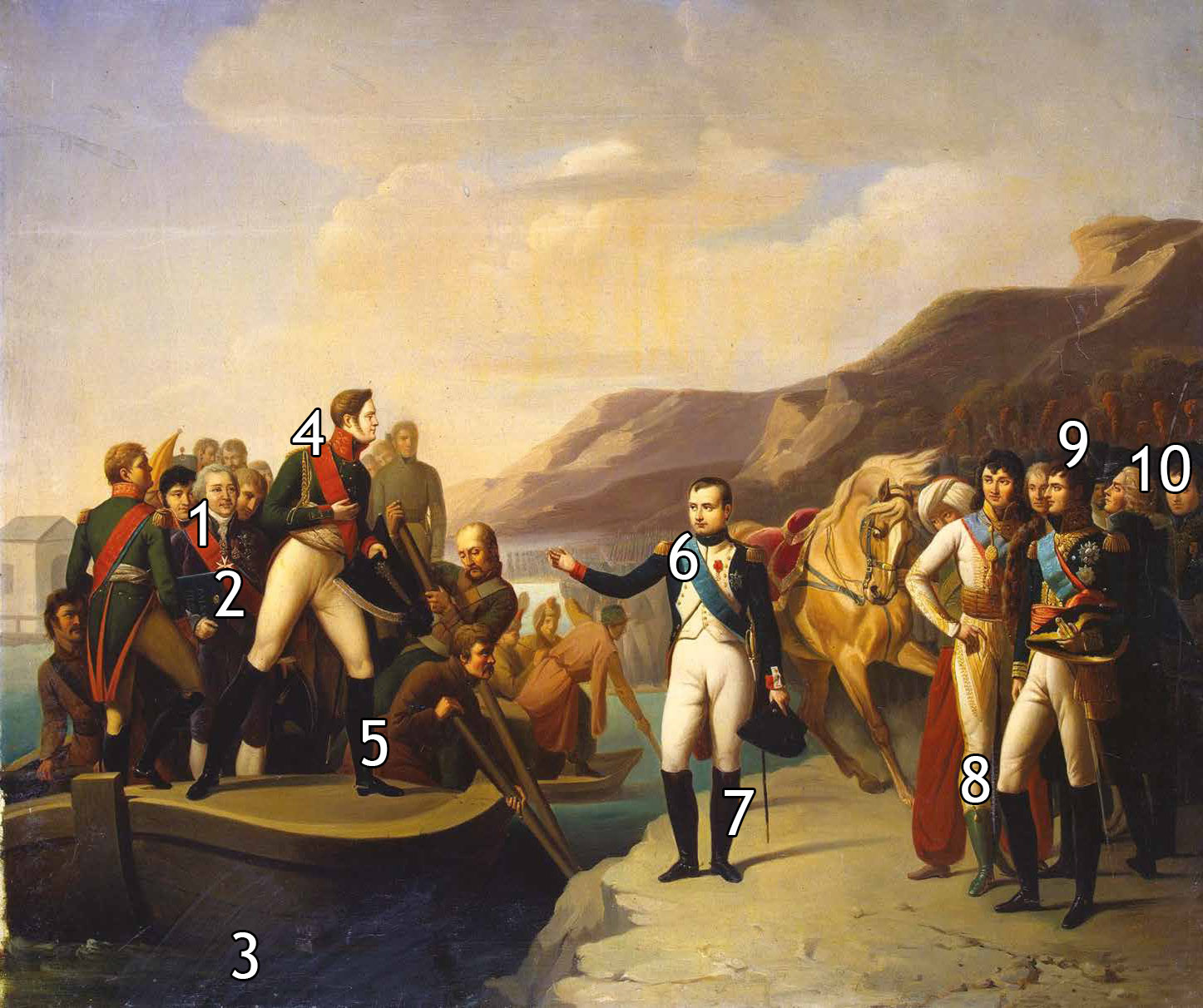 Мир с Францией, подписанный в Тильзите (ныне — Советск в Калининградской области) в 1807 году, многие считают позором России. Антифранцузская политика Александра I в одночасье изменилась, следствием чего стали экономические потери государства и разлад в дворянстве. С другой стороны — мирное соглашение дало России необходимую передышку для подготовки к полномасштабному противостоянию с Наполеоном. Спустя несколько лет после подписания мирный договор исчерпал себя, что и привело впоследствии к событиям 1812 года. Римский художник Джоаккино Серанджели был учеником Жака Луи Давида и прославился в период Французской революции и Первой Французской империи. «Прощание в Тильзите», написанное им в 1808 (1810?) году, представляет собой несколько романтический взгляд на историческое событие, которое само по себе было поставлено довольно театрально. «Прощание в Тильзите» хранится в Версальском дворце. Копия картины кисти неизвестного художника находится в коллекции Государственного Эрмитажа в Петербурге.