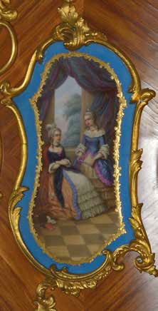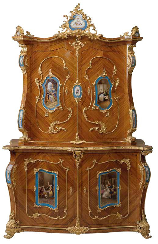 Изысканную гармонию розового дерева, золоченой бронзы и фарфора с живописью демонстрирует шкаф истинно царского достоинства — яркий образец дворцовой мебели в стиле «второго рококо».