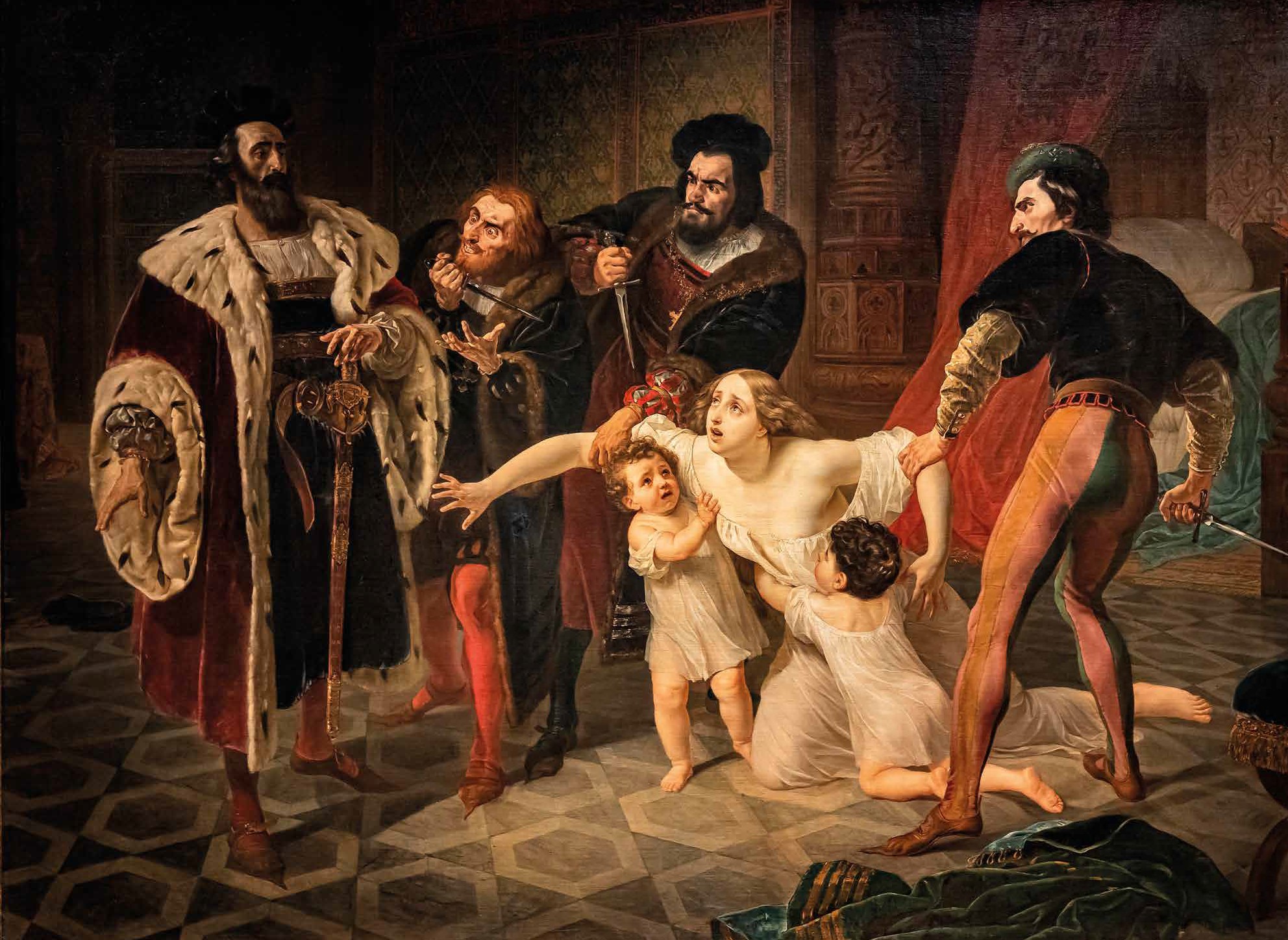 Карл Брюллов написал эту картину в 1834 году всего за 17 дней. В основе сюжета невыдуманный трагический эпизод из истории средневековой Португалии. Претендовавший на престол сын короля Афонсу IV Педру (1320–1367) после смерти законной супруги хотел жениться на своей фаворитке Инес де Кастро. Правитель был противником этого союза, в первую очередь по политическим мотивам, несмотря на то что инфант и его любовница нажили к тому моменту совместных детей. Братья женщины стали советниками Педру и всё больше пытались влиять на принимаемые двором решения. Афонсу приказал убить мать своих внуков, чем разгневал сына. Собрав войско, Педру начал войну с отцом, уступив ему год спустя. Заняв престол в 1357 году, после смерти Афонсу, Педру приказал извлечь тело возлюбленной из могилы, обрядить в царские одеяния, возложить корону, а всем придворным — отдавать почести мёртвой королеве.