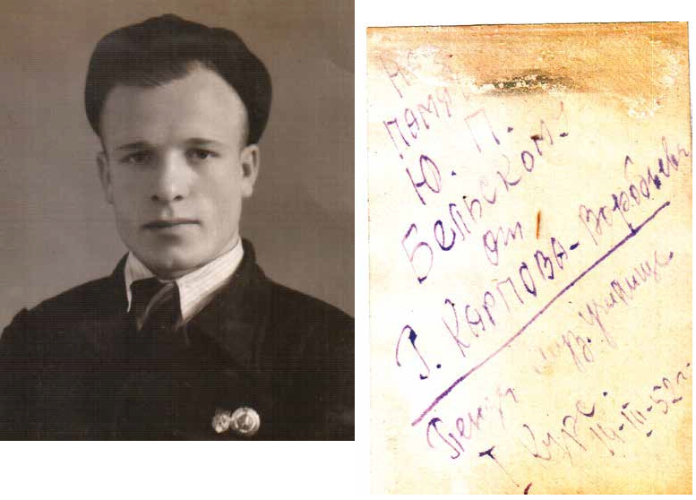 И это не единственное свидетельство, которое нам открывает альбом. На одной из его страниц — фотография некого Карпова-Воробьёва. Надпись на обороте гласит: «На память Ю. П. Бельскому от Г. Карпова-Воробьёва. Пенза. Муз. училище. I курс. 14.III.52 года». При помощи сотрудников Пензенского музыкального колледжа имени Александра Архангельского нам удалось установить, что Карпова-Воробьёва звали Геннадий и он успешно окончил училище по классу валторны 28 июня 1955 года.