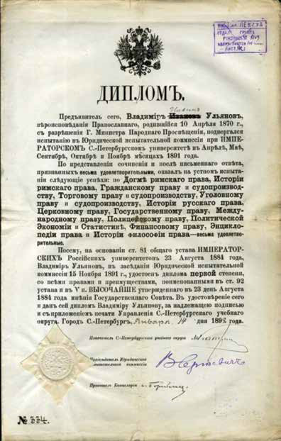 Зачем же он выбрал эту профессию? Рискнём предположить, что методом исключения. Юридическое образование наилучшим образом вписывалось в рано определившийся круг его интересов: политика, политика и ещё раз политика. Философский — слишком заумно, историко-филологический — слишком оторвано от действительности, а больше ничего и не было. Внутри же юридической профессии — либо госслужба, которая ему явно претила (да и для основной страсти — революционной деятельности — не оставалось бы времени), либо университетская кафедра (не тот темперамент!), либо «свободная профессия» — адвокатура. Поэтому, не без труда добившись после участия в казанских студенческих волнениях разрешения сдать экзамены за курс университета экстерном, Владимир Ульянов в ноябре 1891 года получает диплом с отличием и уезжает в Самару.