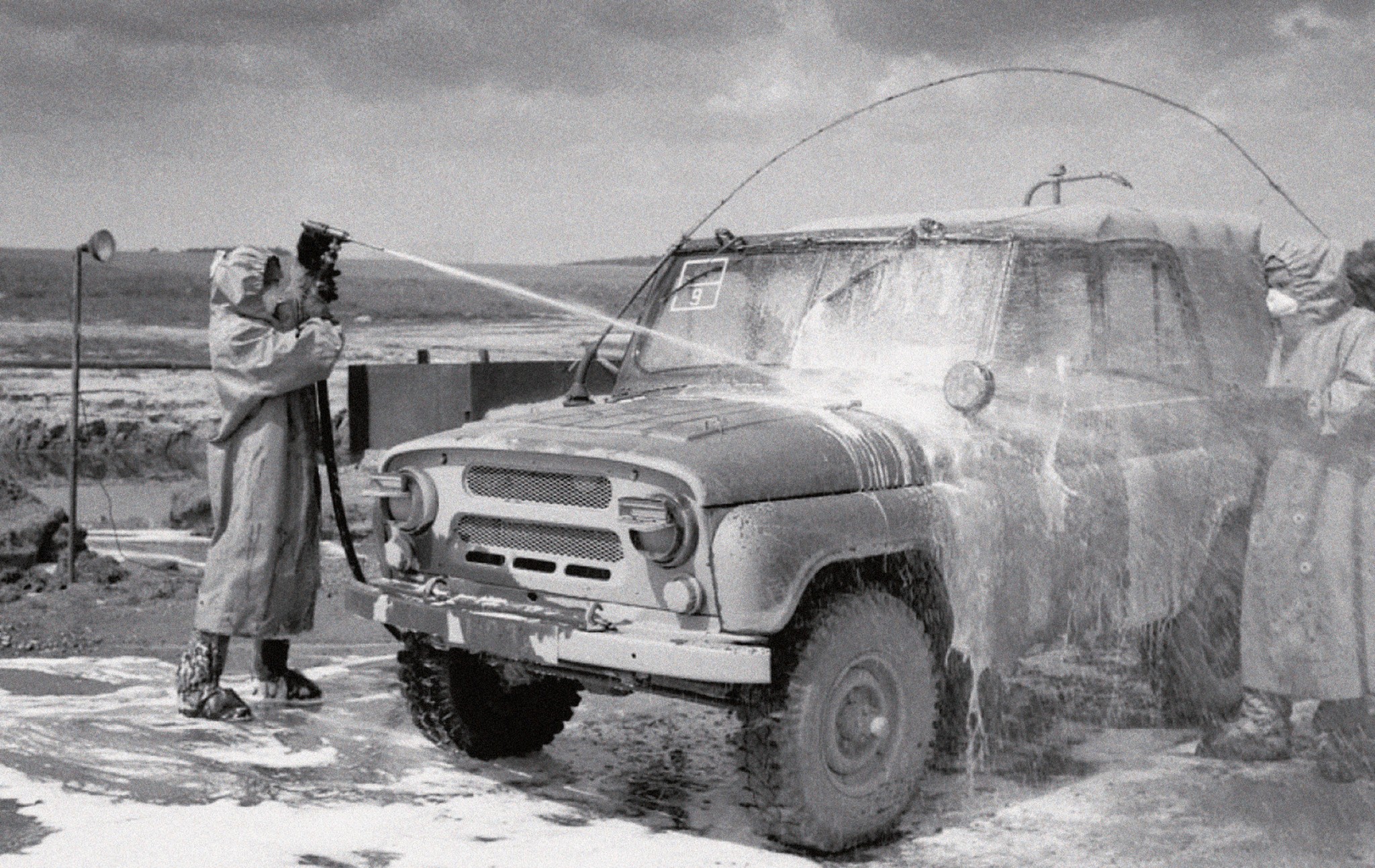 Борьба с радиоактивным заражением. Валерий Легасов сразу по прибытии в зону аварии фактически лично возглавил работы по ликвидации последствий катастрофы. Многие процессы — от способа тушения очагов пожара в реакторе до вариантов дезактивации — проводились по придуманным им методам. Работы по дезактивации техники в зоне ликвидации последствий аварии. Фото 1987 года