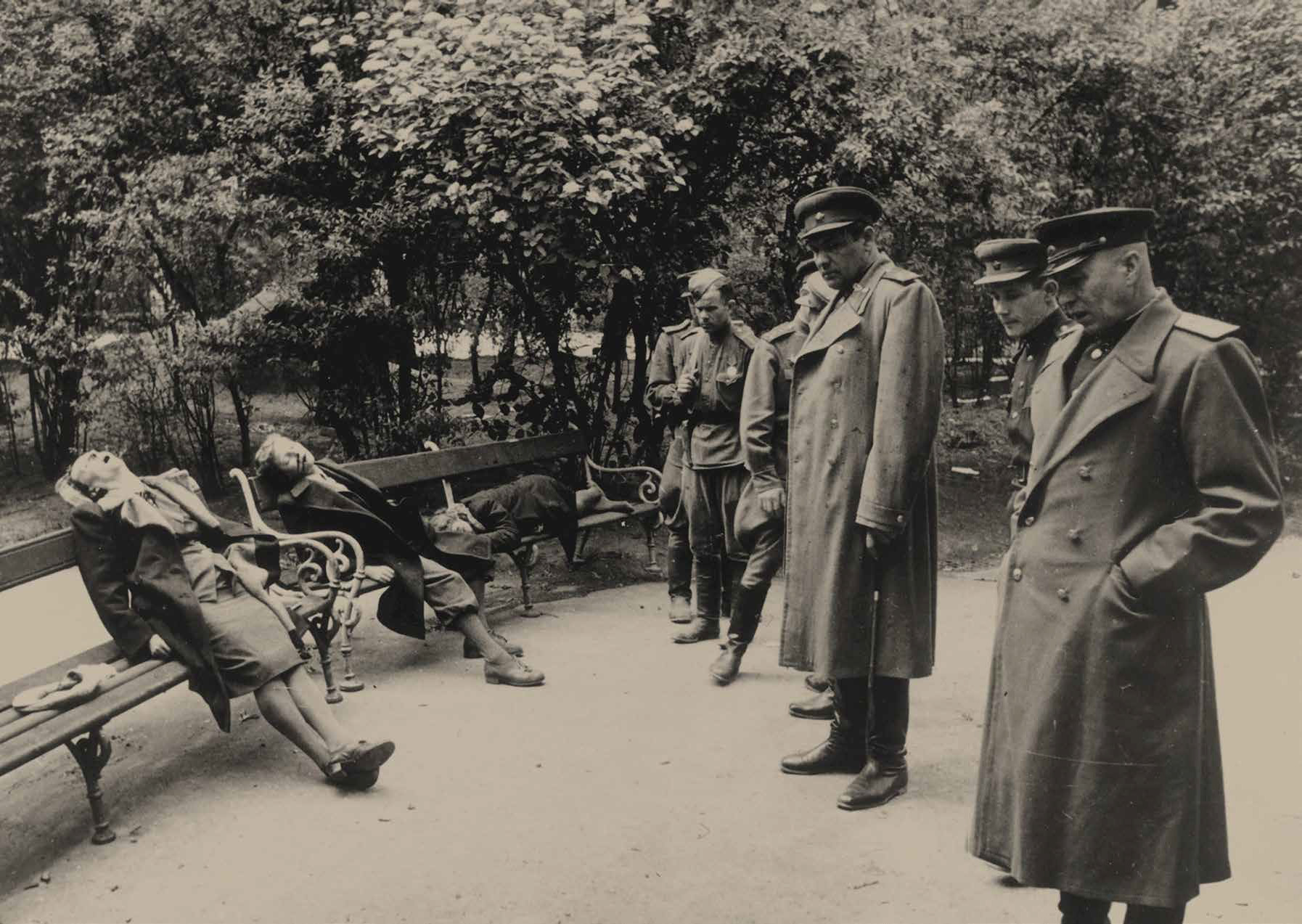 Снимок убитой нацистской семьи сделан в австрийской столице знаменитым советским фотографом Евгением Халдеем. Вот как он сам вспоминает этот эпизод: «Я пошёл в парк у здания парламента, чтобы снять проходящие колонны солдат. И увидел эту картину. На скамейке сидела женщина, убитая двумя выстрелами — в голову и шею, рядом с ней мёртвые подросток лет пятнадцати и девочка. Чуть поодаль лежал труп отца семейства. На лацкане у него был золотой значок НСДАП, рядом валялся револьвер. Подбежал вахтёр из здания парламента: