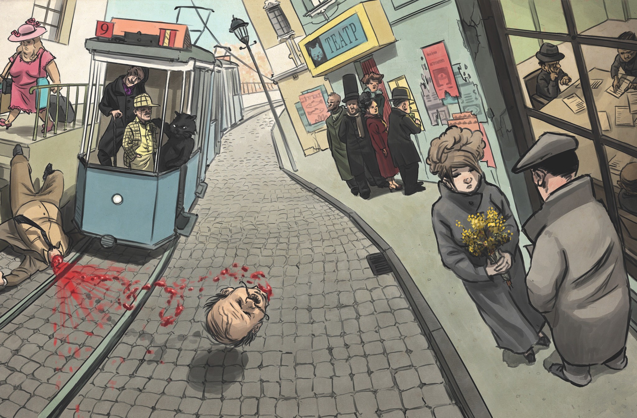 «Берлиоз не стал слушать попрошайку и ломаку регента, подбежал к турникету и взялся за него рукой. Повернув его, он уже собирался шагнуть на рельсы, как в лицо ему брызнул красный и белый свет: загорелась в стеклянном ящике надпись "Берегись трамвая!". Тотчас и подлетел этот трамвай, поворачивающий по новопроложенной линии с Ермолаевского на Бронную. Повернув и выйдя на прямую, он внезапно осветился изнутри электричеством, взвыл и наддал».