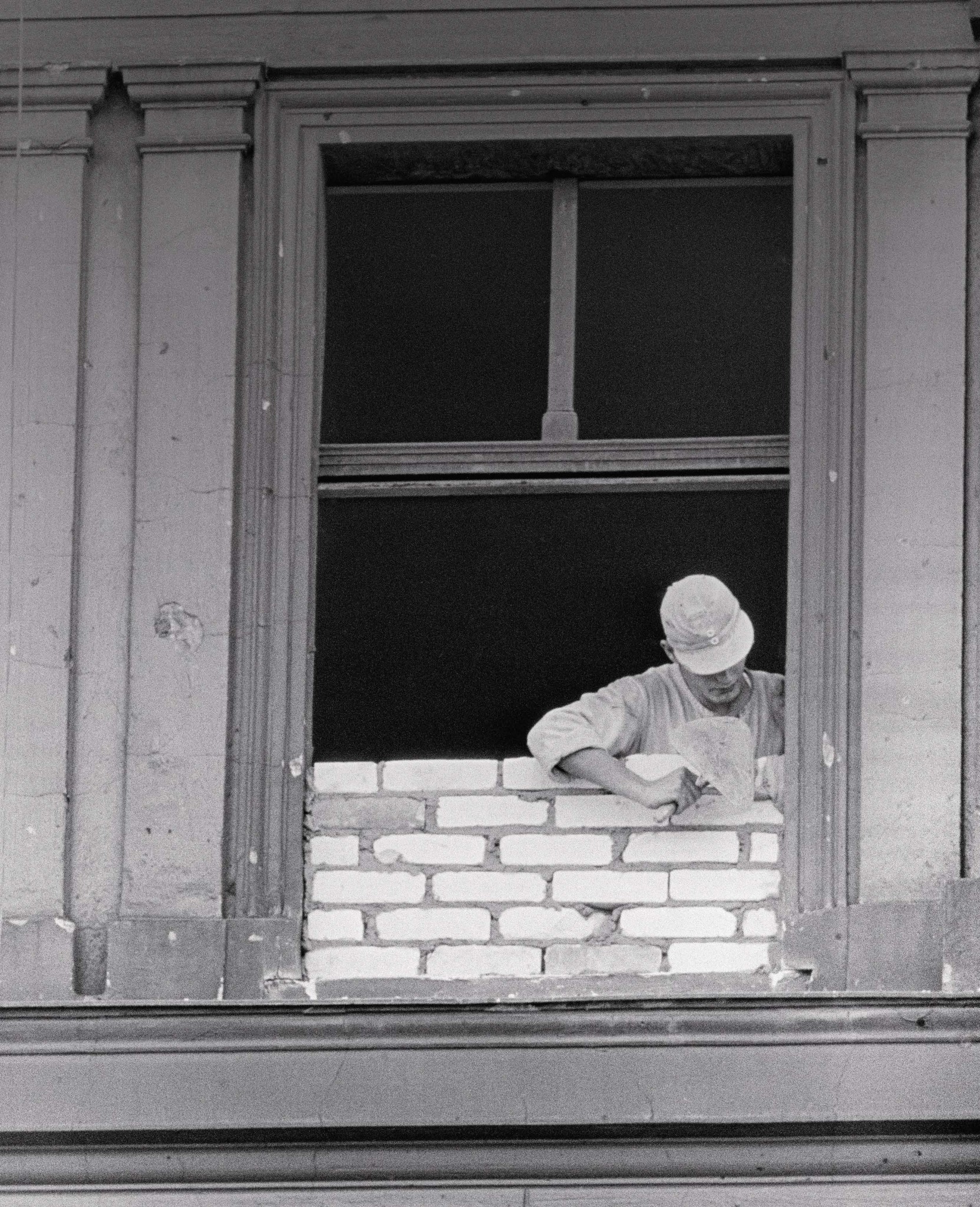 Восточноберлинский рабочий заделывает окно, выходящее на Западный Берлин