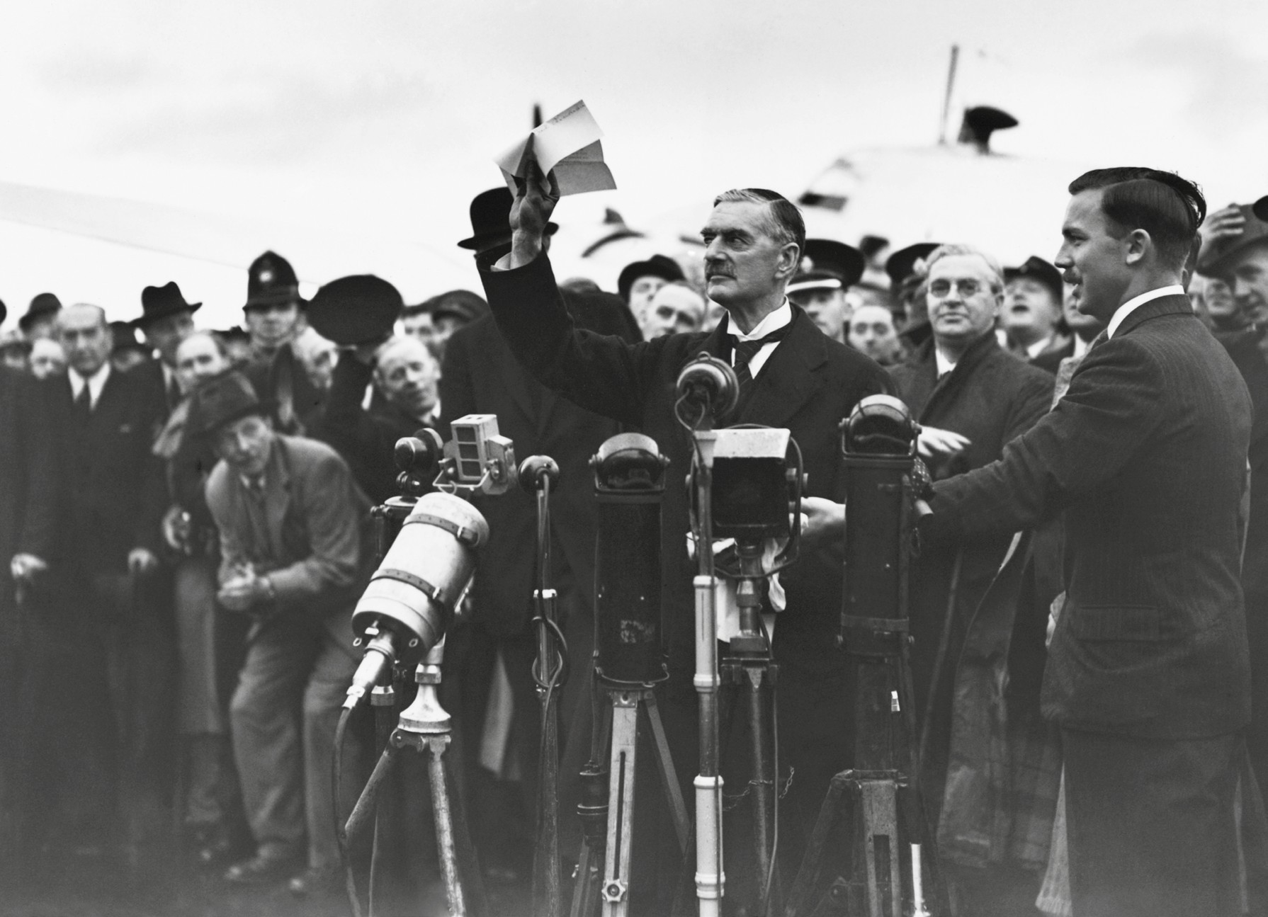 Листок бумаги, который премьер-министр Великобритании Невилл Чемберлен предъявил собравшейся на аэродроме публике, — это англо-германская декларация о мирном разрешении возможных конфликтных ситуаций. Схожий документ Гитлер подписал и с французским премьером Эдуаром Даладье. Ради этой бумаги, которую оба премьера посчитали гарантией мира, они пошли на заключение Мюнхенского соглашения (в советской терминологии — «Мюнхенский сговор»). Потрясая листком с декларацией, Чемберлен объявил соотечественникам: «Я привёз мир нынешнему поколению». А ещё раньше он заявлял: «Подумайте, есть ли у нас оправдание для того, чтобы начать войну? Я думаю, нет. Этим утром я летел над Темзой и с ужасом представил себе, что в нашем небе может появиться немецкий бомбардировщик. У нас нет выбора. Нам придётся позволить Германии оккупировать Судеты, потому что у нас нет сил этому помешать».