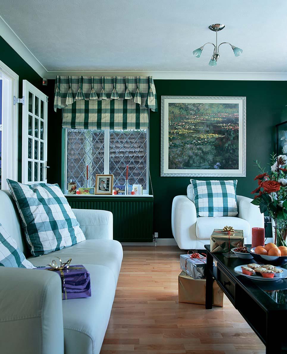 В моде — темные глубокие оттенки зеленого: считается, что они благотворно воздействуют на нервную систему и помогают создать спокойную гармоничную обстановку. Этот цвет подходит практически для любой комнаты. В спальне будут неплохо смотреться темно-зеленые портьеры и покрывало. Для гостиной лучше выбирать изумрудный: набросайте подушек и повесьте тяжелые фактурные портьеры.
