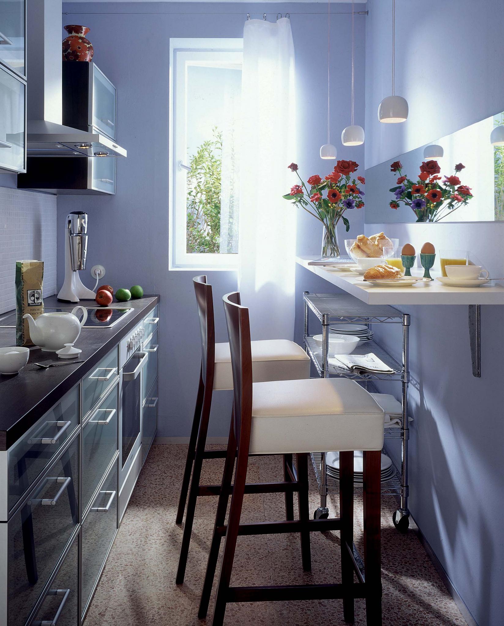 Современный дизайн — идеальное решение для маленькой кухни. Можно сыграть на контрасте и оформить кухню в стиле “минимализм”. Это подчеркнет функциональность пространства. Второй вариант — белая классика (она визуально расширит кухню). В этом случае важно придерживаться простоты и строгости: вам нужные прямые линии или очень плавно закругленные формы. Будьте аккуратны с деталями! Будет вполне достаточно одного акцента, привлекающего внимание. Это может быть дизайнерский “фартук” или необычная, интересная по форме люстра над столом (чем более яркие лампы вы выберете, тем лучше).