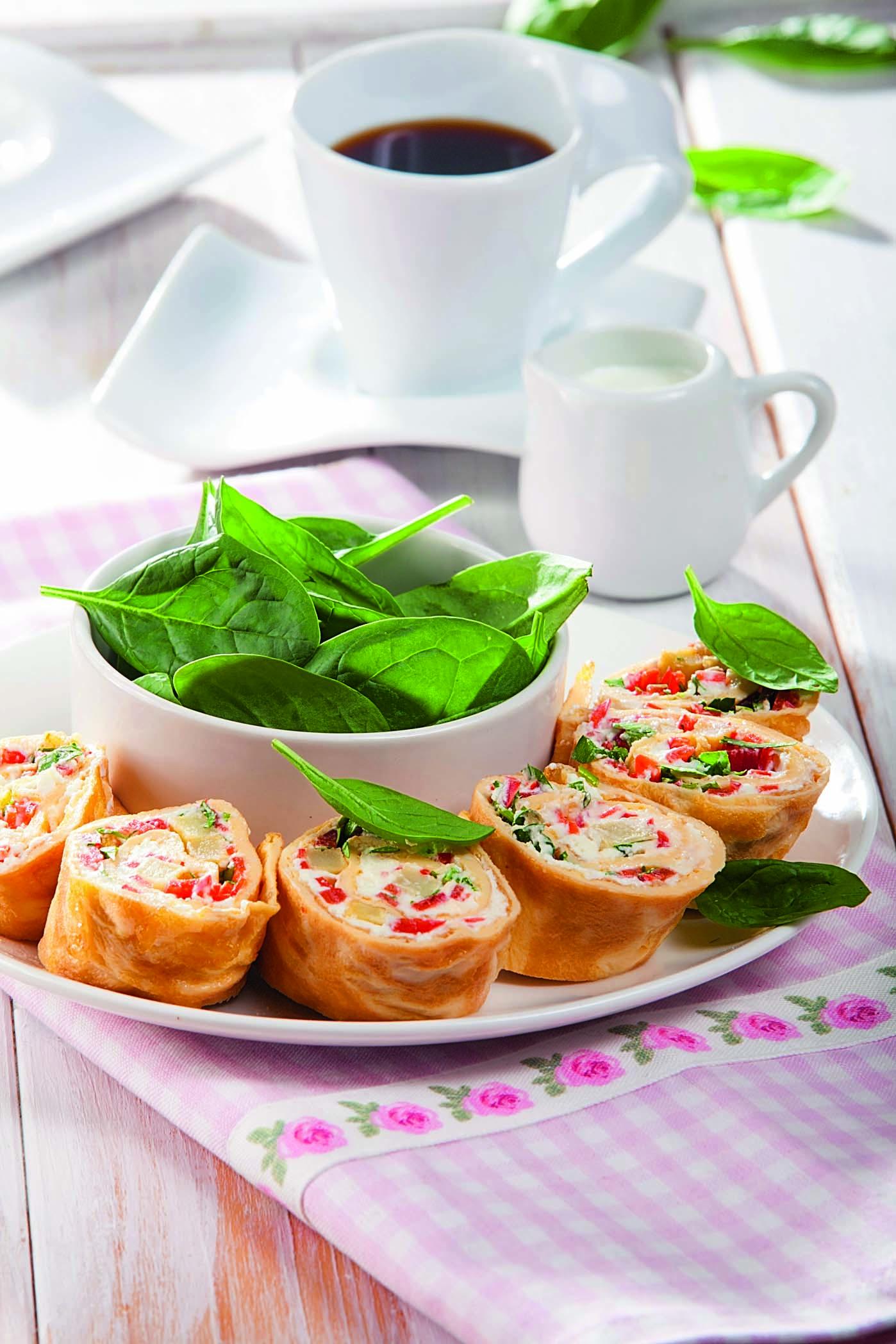 Омлеты посыпать оставшимся сыром фета и слегка размазать его ножом. Сверху распределить приготовленную начинку. Омлеты свернуть рулетами, завернуть в пленку и убрать в холодильник на 2 ч. Затем пленку снять, рулеты крупно нарезать и подать на стол.