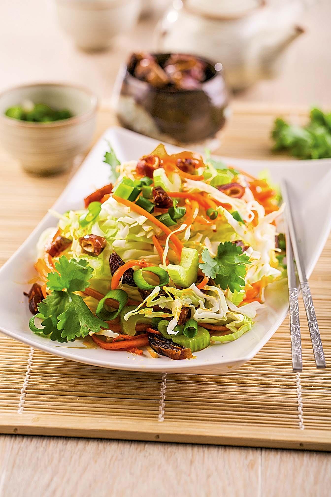 Для соуса оставшееся масло смешать с лимонным соком, посолить и поперчить. Капусту, сельдерей, финики, лук и кинзу перемешать с морковью. Полить приготовленным соусом и подать на стол.