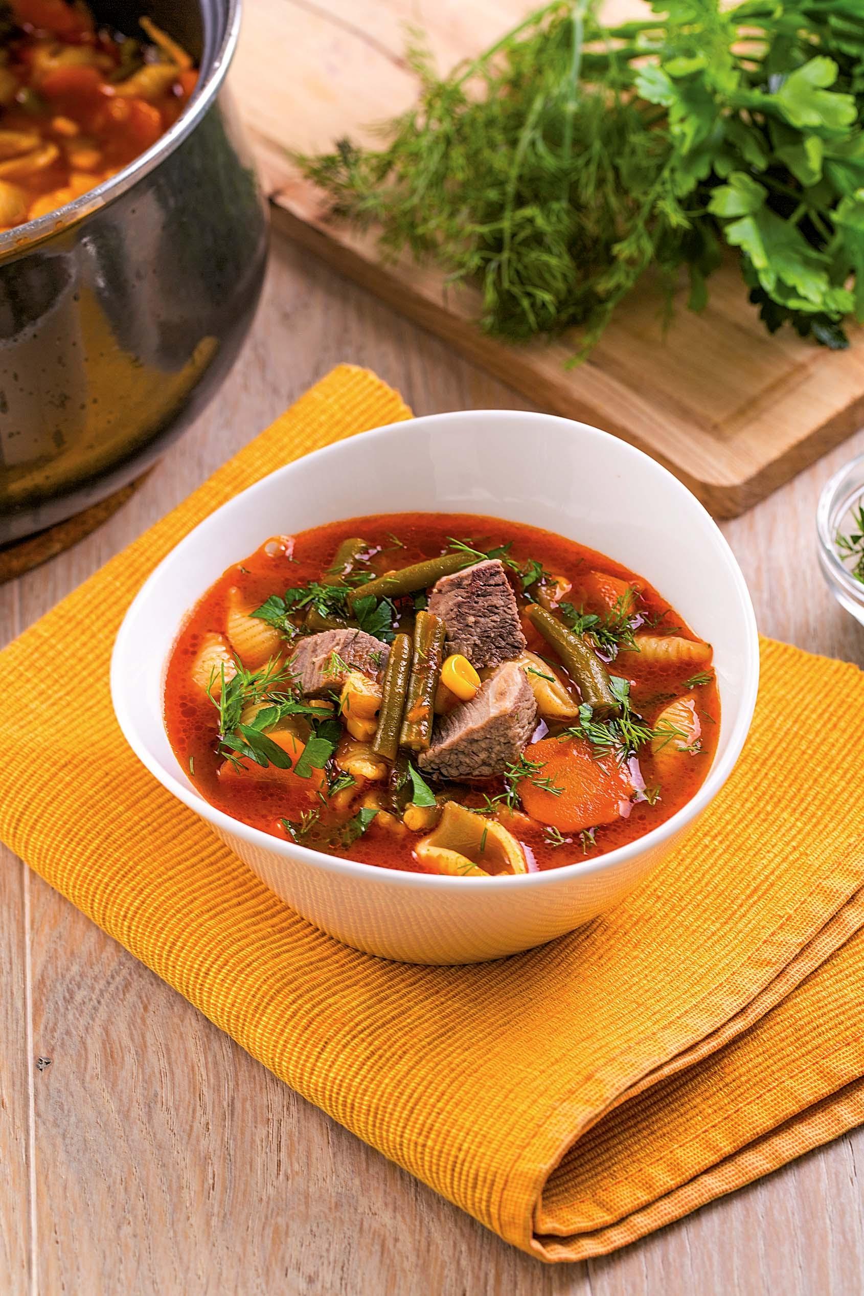 Мясо залить 3 л воды и довести до кипения. Пену снять, добавить перец-горошек, лавровый лист и неочищенную луковицу. Варить 2 ч. Бульон процедить, мясо отделить от кости и нарезать. Сельдерей натереть. Оставшуюся луковицу порубить. Морковь нарезать кружочками. В сковороде нагреть масло и подрумянить лук. Добавить морковь с сельдереем и жарить, помешивая, 5 мин. Подмешать томат-пасту, влить 100 мл бульона и тушить 10 мин. Бульон довести до кипения, положить овощи и варить 3 мин. Добавить фасоль и кукурузу, варить еще 5 мин. Посолить и поперчить. В бульон с овощами положить макаронные изделия и варить 7 мин. Разлить по тарелкам, в каждую добавить мясо и рубленую зелень.