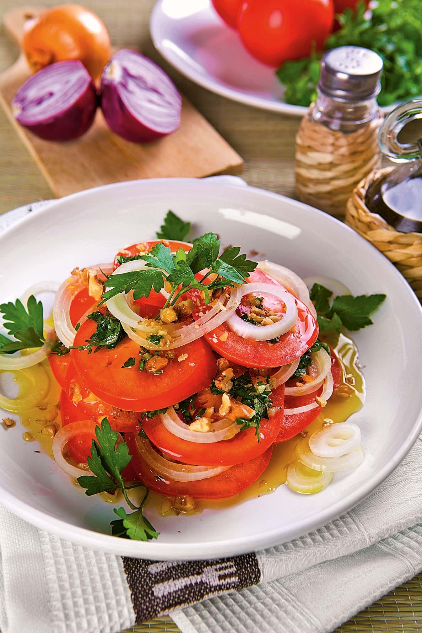 Кружки помидора сложить башенкой, чередуя с кольцами лука, поливая каждый слой приготовленным соусом и посыпая орехами. Сверху вылить оставшийся соус и оставить на 30 мин. Перед подачей украсить листочками петрушки.