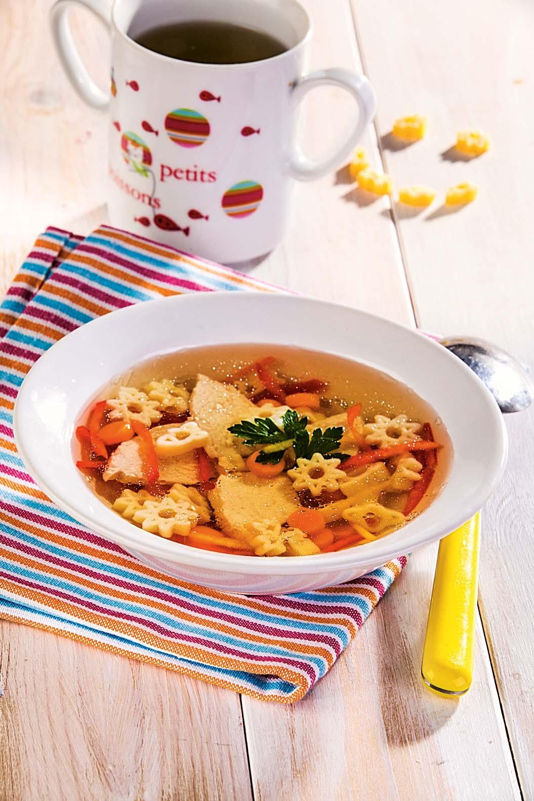 Куриное филе залить 1,5 л воды, довести до кипения и варить 45 мин. Процедить, бульон собрать, филе нарезать. Лук нарезать колечками, морковь и сладкий перец — соломкой. Овощи переложить в кипящий бульон, посолить, всыпать макаронные изделия и варить 10 мин. Суп разлить по тарелкам, в