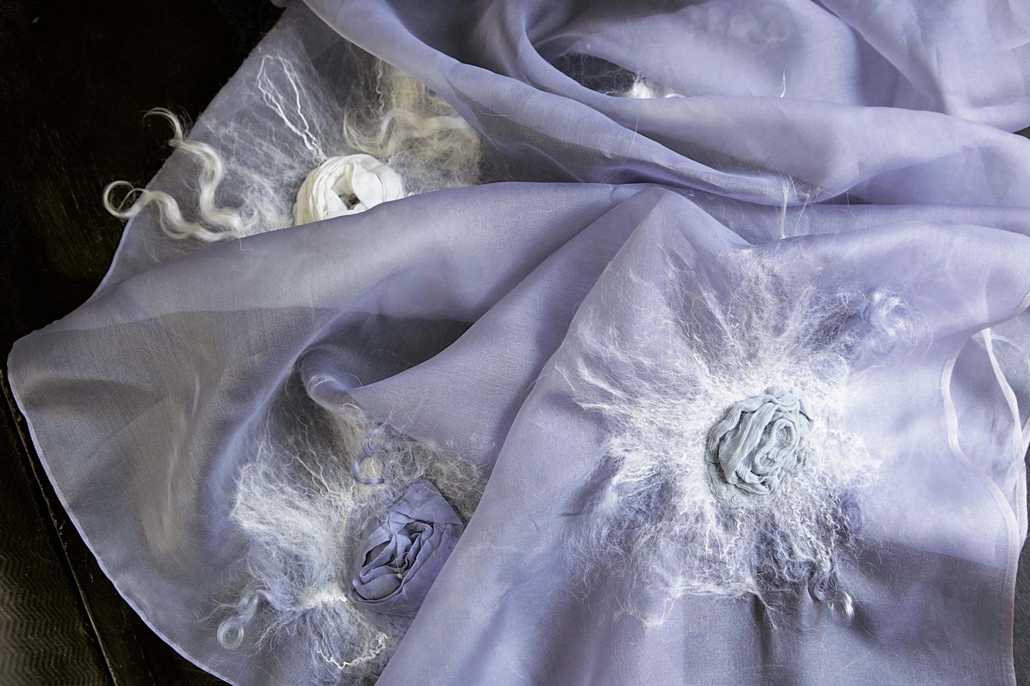 ● шарф из шелковой органзы (его можно выкроить из шелковой ткани и подшить швом “рулик”) ● окрашенные вручную локоны шерсти ангорской козы 2–3 цветов ● 5 г 16-микронной гребенной ленты (или топса) ● 2 г волокон вискозы ● 6 полос из шелковой органзы двух разных цветов 30 х 7 см ● водорастворимый маркер ● мыльный раствор ● москитная сетка ● силиконовые перчатки ● пузырчатая пленка ● две щетки с острыми металлическими зубчиками
