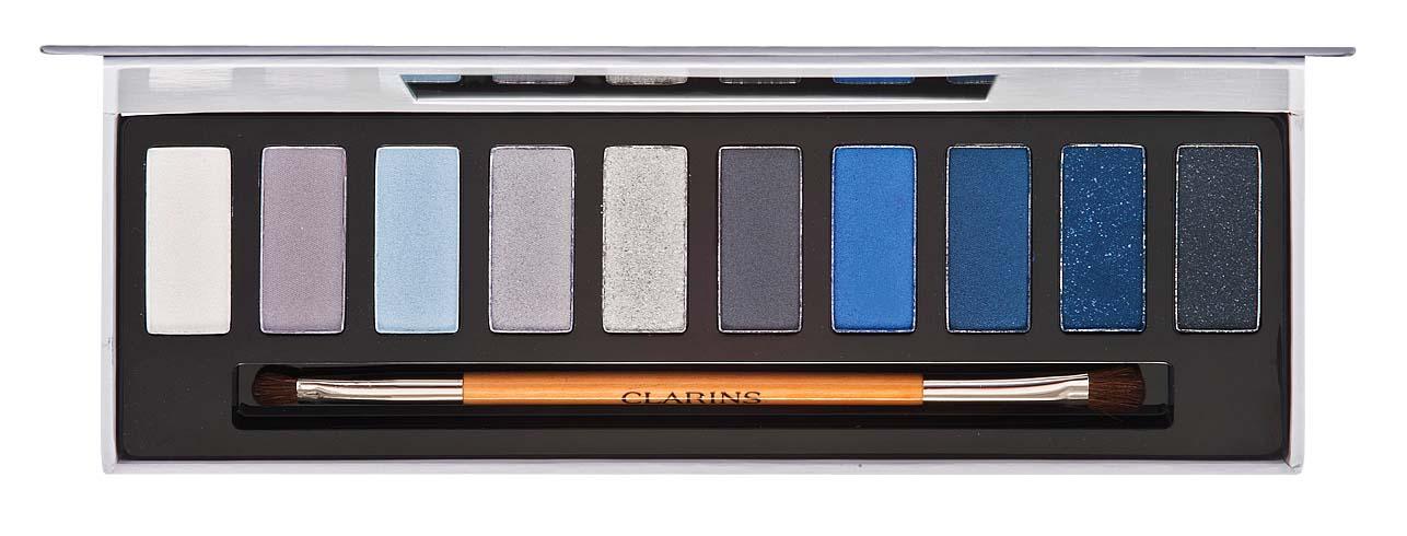 На верхнее подвижное веко нанесите базу под тени, на складке растушуйте бежевые тени – они сгладят резкий переход от светлой кожи к темным оттенкам, которые будут использованы в макияже. Во внешний уголок глаза добавьте темно-серые тени и растушуйте их кисточкой вверх, к хвостику брови. На подвижное веко нанесите синие сияющие тени. Снизу подчеркните контур глаза синим карандашом, а во внутренние уголки добавьте белые мерцающие тени.