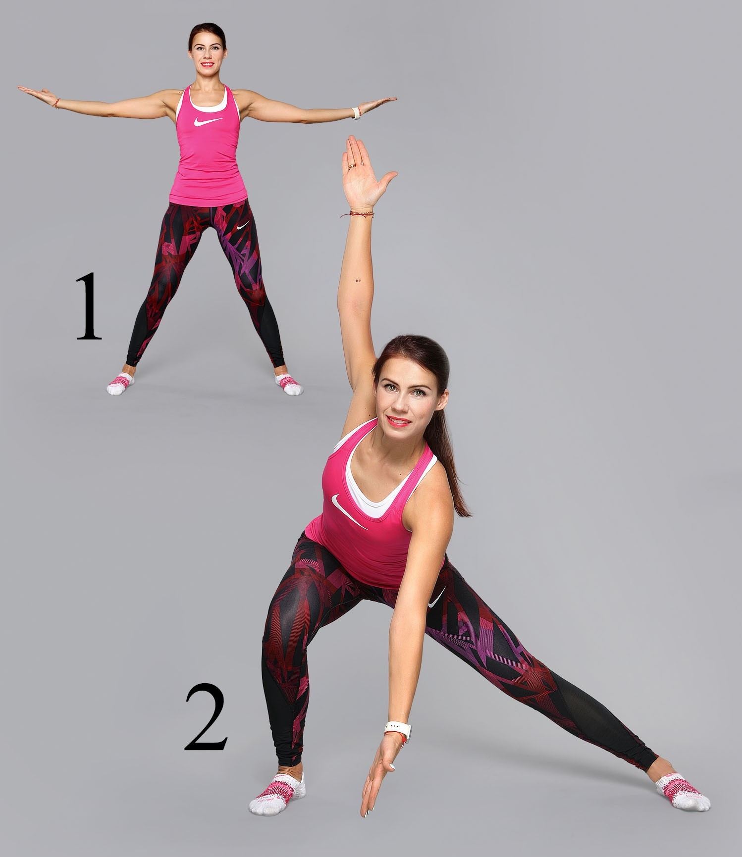 Стопы шире плеч параллельно друг другу, руки разведены в стороны ладонями вверх (1). На вдохе согните правую ногу в колене, одновременно отведите таз назад и удерживайте напряжение в лопатках. На выдохе скрутитесь в области талии в правую сторону (2) так, чтобы почувствовать растяжение во внутренней и задней поверхностях бедра. 10 раз.