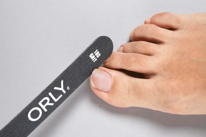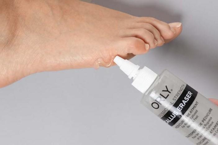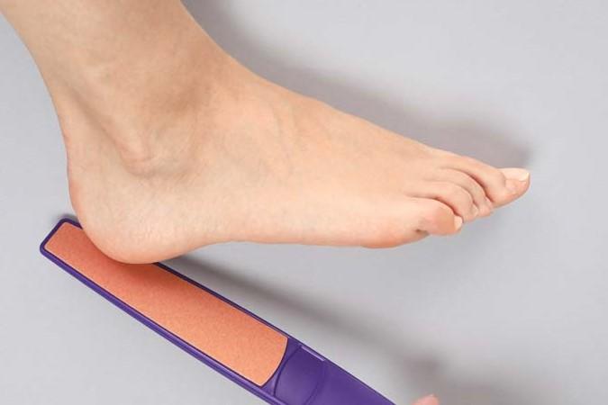 2. Смойте средство теплой водой или уберите излишки ватным диском. Педикюрной пилкой для шлифовки удалите мозоли и огрубевшую кожу пяток.