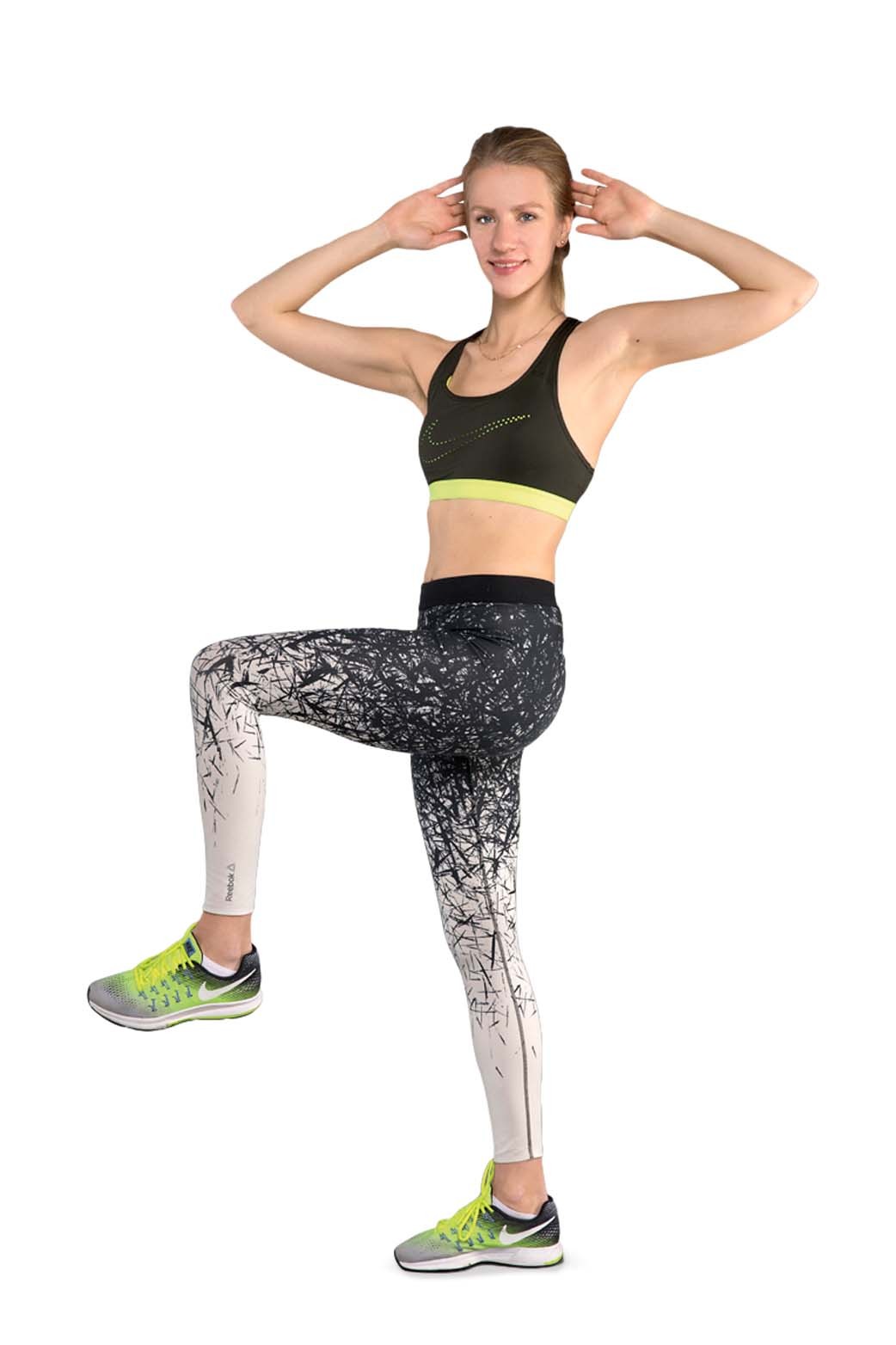 Встаньте прямо, стопы — чуть уже ширины плеч. Согните руки в локтях, положите ладони на талию. Выполните наклон, опираясь на правую ногу, а левую слегка согните и поставьте на носок (1). Тазом потянитесь назад, а макушкой вперед. На выдохе выпрямите спину, одновременно заводя руки за голову, поднимая левую ногу так, чтобы бедро было параллельно полу и разворачивая корпус вправо (2). Повторить 10 раз, сменить ногу и выполнить еще столько же.