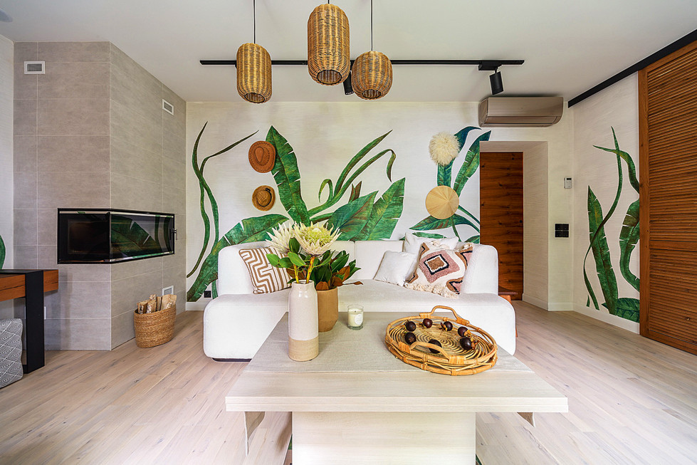 Классное решение стен, на мой взгляд, в одном из наших проектов предложила дизайнер Анна Петрова. Крупный рисунок растений, выполненных художницей Александрой Калиничевой, меняет масштаб пространства — и оно визуально кажется намного больше.