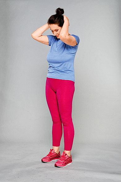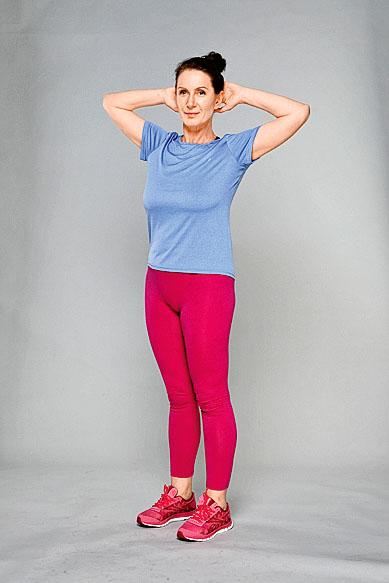 Как делать: Встаньте прямо, соедините ладони на затылке и разведите локти в стороны (фото 1). На выдохе давите руками на затылок, стараясь свести локти (фото 2). На вдохе вернитесь в исходное положение (И.П.), раскрывая грудную клетку.