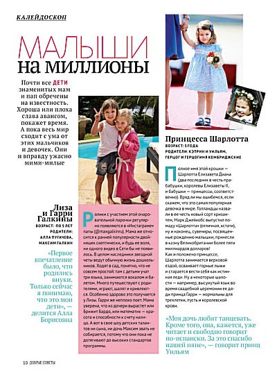 Читала статью про знаменитых детей, разглядывала фотографии, умилялась и вдруг поняла, что я больше всего люблю в вашем журнале. Мне ведь его дочка показала! Она как-то шла из института, купила в киоске номер, принесла домой, сказала: «Мам, отлично пишут, тебе понравится!» И действительно, понравилось, она не ошиблась. Дочка вышла замуж, стала жить отдельно. А традиция покупать «Добрые советы» осталась — моя девочка всегда привозит мне очередной выпуск, когда в выходные приезжает в гости. Мы пьем чай, разговариваем обо всем важном, и в том числе обсуждаем ваши статьи. Надеюсь, когда-нибудь у