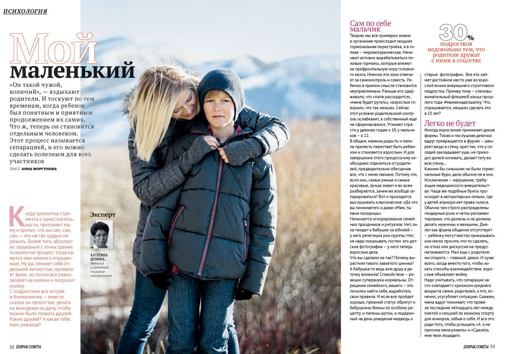 В последнее время полюбила загибать уголки в журналах, чтобы в конце чтения пройтись по понравившимся материалам еще раз. Февральский номер получился чемпионом в моем личном рейтинге… Ну а всех сильнее были загнуты страницы со статьей «Мой маленький». Огромное спасибо редакции, автору Анне Моргуновой и эксперту психологу-консультанту Катерине Деминой за мастерскую подачу такой сложной темы, как отношения с подрастающими детьми. Поняла, что не нужно ничего усложнять: «просто все привычное изменилось». Лучше предложу своему 16-летнему «сепаратору» посмотреть фильм «Громкая связь»,