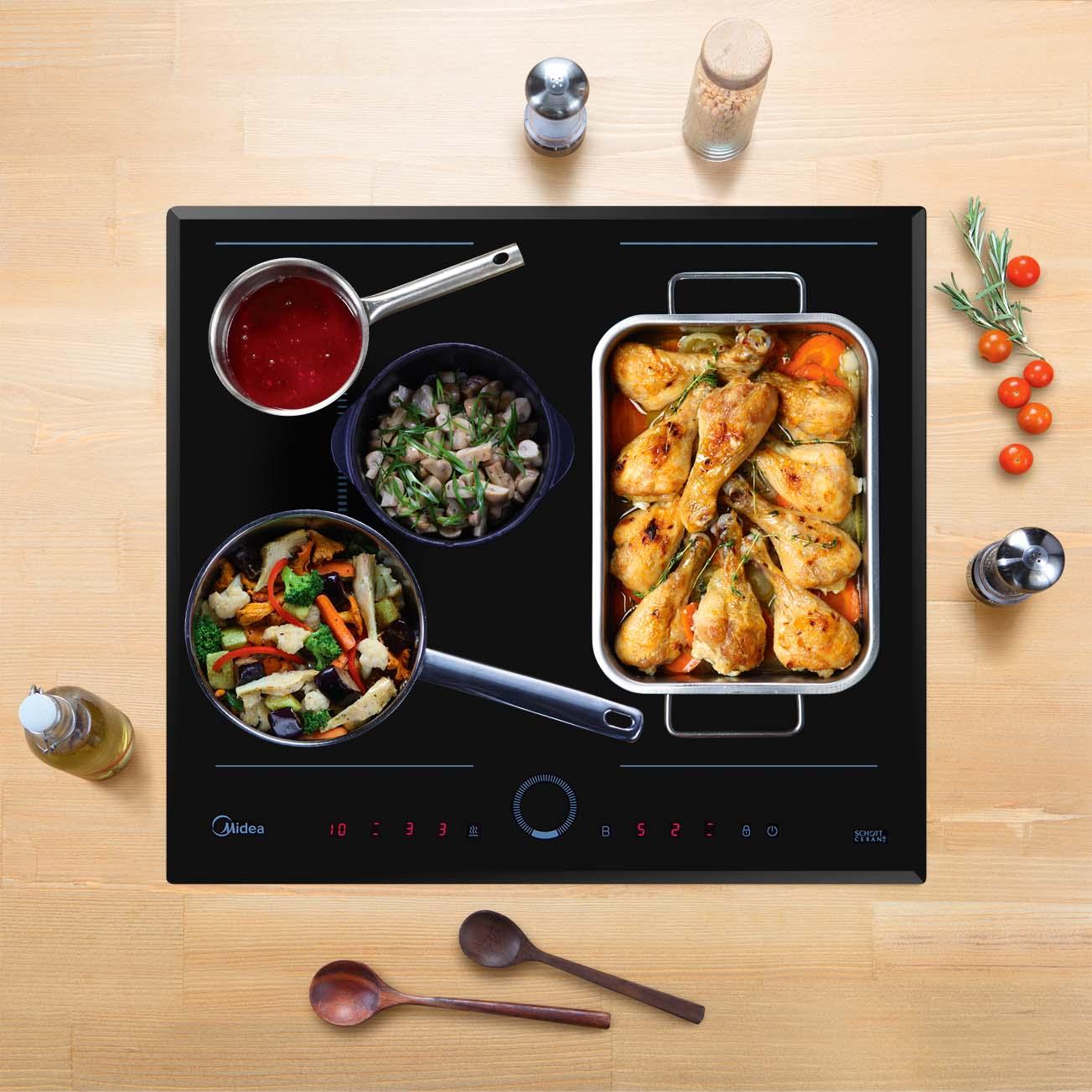 Порой большой кастрюле и сквородкам бывает тесно на плите. Но есть хорошая новость для тех, кто любит готовить. Варочные поверхности Midea с функцией FreeZone решат эту проблему. Теперь вы можете ставить посуду любого диаметра в любом месте плиты. Просто объединяете две зоны нагрева в одну общую и легко управляете ей. Варочная поверхность сама приспособится к посуде, а не наоборот.
