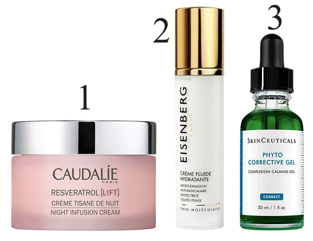 Вечером: Макияж снимаем молочком, затем в дело идет гель для умывания (тот же, что и утром). После очищения — успокаивающая сыворотка, вслед за ней питательный крем с маслом жожоба или оливы. Или с мощным антиоксидантом — ресвератролом: он поможет коже восстановиться за ночь.