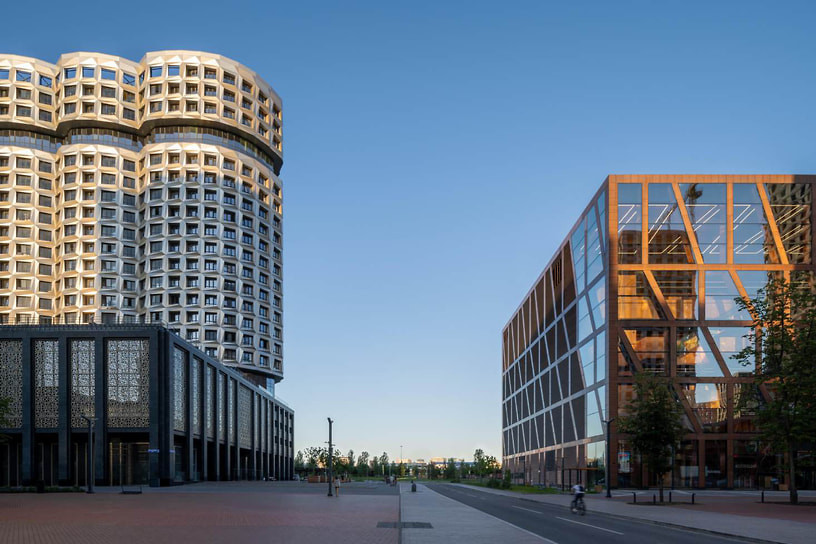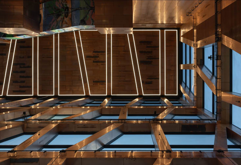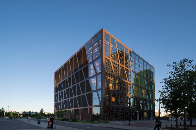 Зеркальные фасады музейного куба, испещренные рыжеватыми прожилками меди, отражают осеннее небо — уносящуюся вверх синеву с белыми облаками. Под ярким светом фасады выглядят темными. Кажется, войдешь внутрь и попадешь в сумрак. Но выходит наоборот. Прозрачное лобби изнутри залито светом и наполнено воздухом.